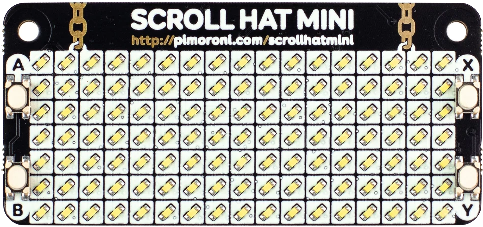 Scroll HAT mini is a 17x7 matrix of bright white LEDS that can be invdividually controlled for brightness and on/off states.